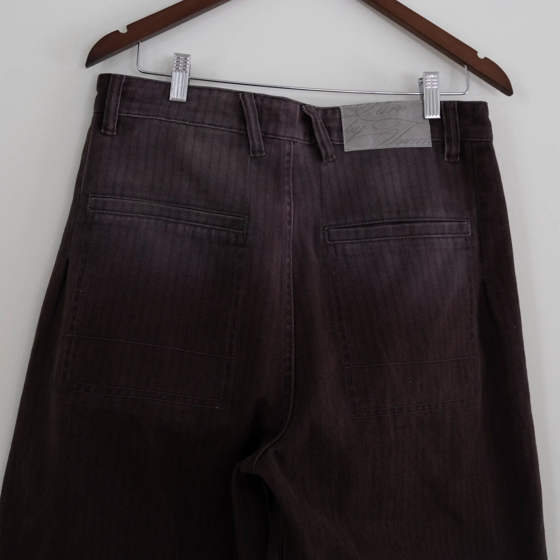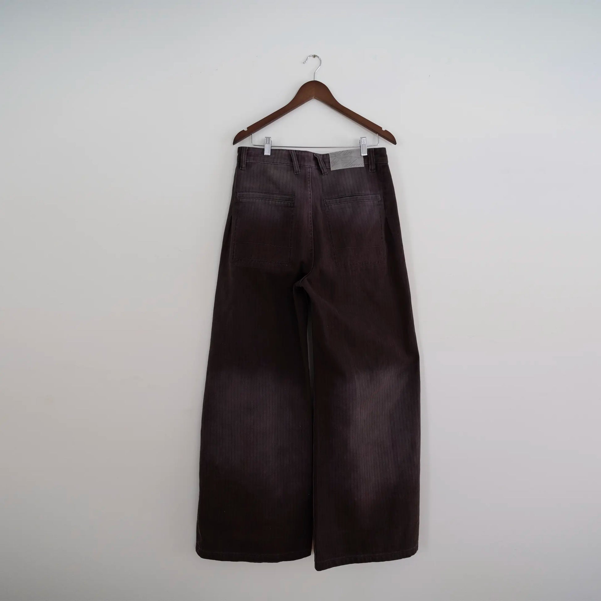 baggy wide-leg brown twill cotton pants with a pinstripe pattern.