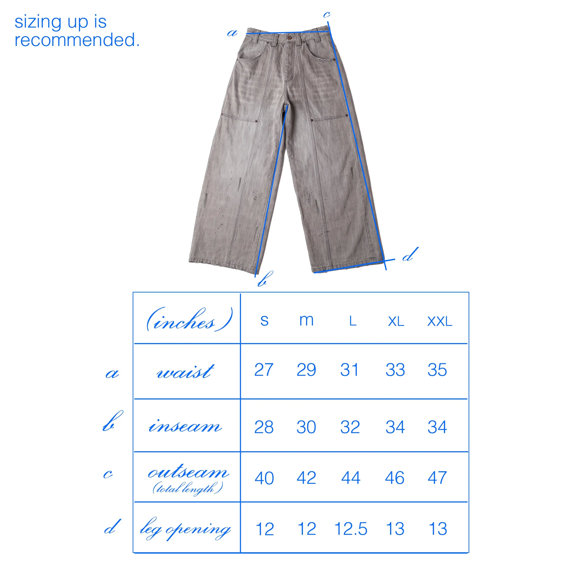 gray selvedge denim with a baggy, wide leg fit.