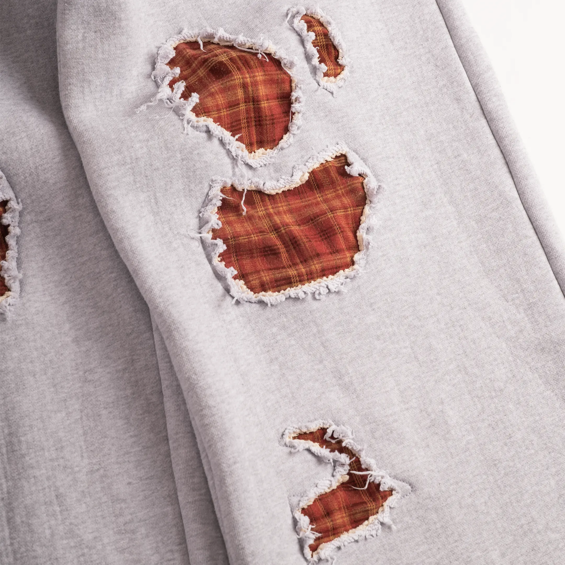 heather gray french terry heavyweight baggy sweatpants with plaid patches.